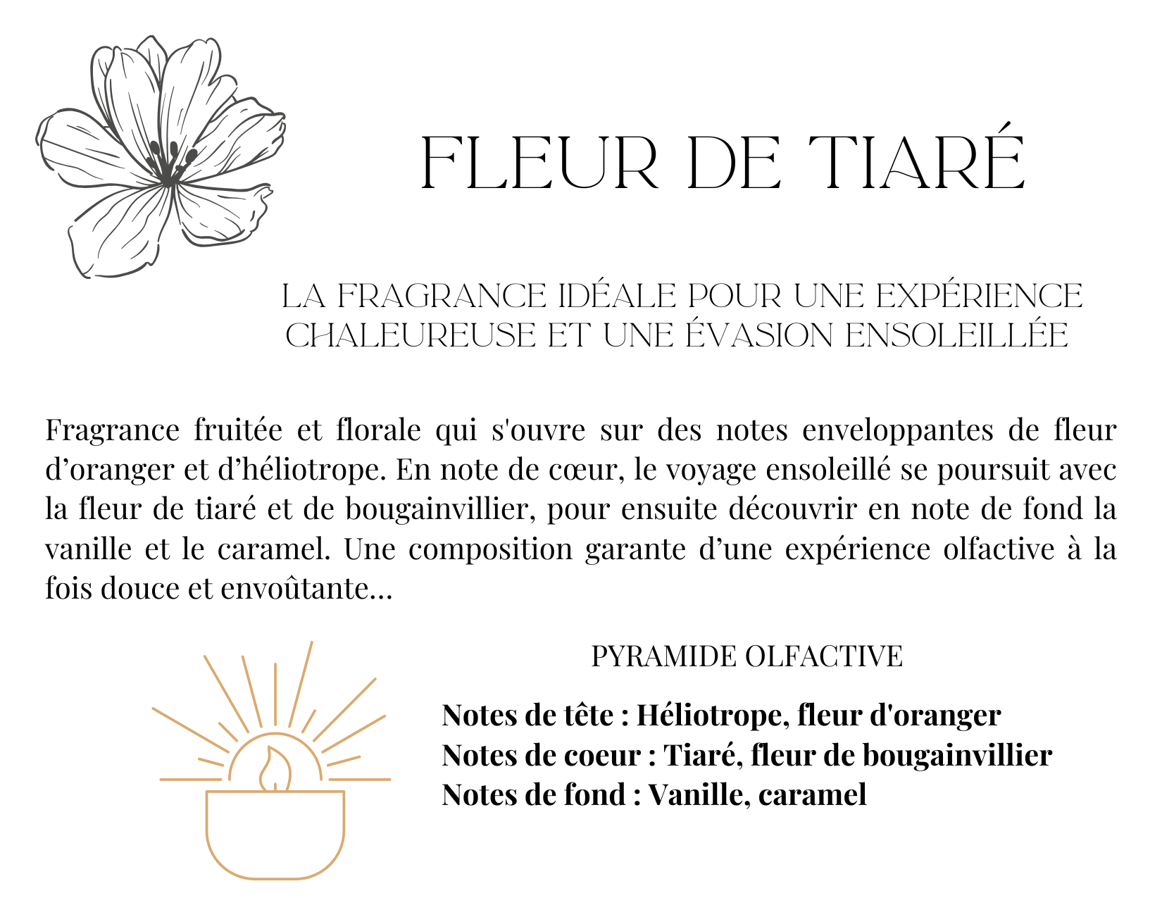 Fragrance fruitée et florale qui s'ouvre sur des notes enveloppantes de fleur d’oranger et d’héliotrope. En note de cœur, le voyage ensoleillé se poursuit avec la fleur de tiaré et de bougainvillier, pour ensuite découvrir en note de fond la vanille et le caramel. Une composition garante d’une expérience olfactive à la fois douce et envoûtante...